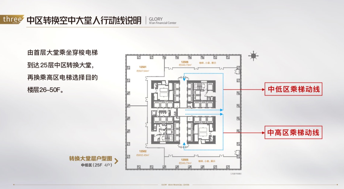 西北第一高楼 超高层国际甲级精装写字间 国瑞·⻄安金融中心,位于⻄安市高新区锦业路10号,国 际金融港核心位置,由北京国瑞置业倾力打造。 项目总高350米共75层,业态涵盖金融商务、文化旅游、 展览展示、会议交流、休闲餐饮等功能。建筑主体外观设 计简洁优雅,建筑线条笔直、高耸,是高新国际金融港地 标项目,点亮丝路经济新高度。 同时,在320米的高空,设计了⻄安最高的观光层,城市 观光旅游体验的最高点,也是高端商务洽谈场所。项目建 成后,将聚集众多新兴金融产业及世界500强名企。 9米/秒高速运行,平均等候不超过25秒 71部进口迅达、日立品牌电梯 71部进口迅达、日立电(扶)梯,2250KG最大载重量,9米/秒最 高时速,仅需40秒即从负一层直达320米云顶观光层; 客梯采用最智能的控制系统——目的楼层控制系统,垂直运输实 现统一控制管理,运送效率发挥到最大。高峰时段,平均等候时 间不超过25秒; 无论是区间高速客梯数量、运送效率、最高速度均为⻄北之最。 地铁六号线:地铁六号线丈八一路站,坐享高新繁华轴心之利。 地下环隧:高新国际金融港各项目地下全线贯通。 南三环:紧邻南三环,绕城高速,高效路网,畅行全城。 绕城高速:半小时即达客运北站,商务出行,快人一步。
