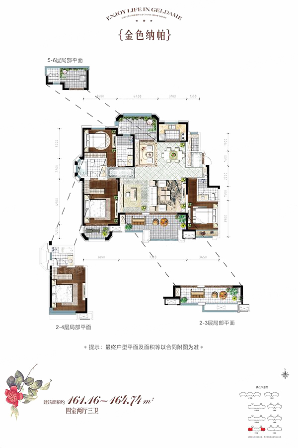 打造纯粹褐石洋房住区,共22栋楼,容积率仅为1.72,应用金地独有的360度景观健康家产品打造美式风情园林,外立面采用美式褐石红砖打造,历久弥新。秉承慢生活的基调,项目利用“褐石”符号打造风情社区,突出“慢”生活主题;其中褐石系洋房,作为符号性标杆产品;洋房区规划两种平层产品,面积约为150㎡和167㎡,楼层数为6层及9层,根据项目情况选配应用金地独有的360度景观健康家产品的亮点。采用金地褐石产品系,源自波士顿褐石街区,极具风情感的生活社区。 金地南湖艺境撒三期洋房总建筑面积约8万平方米,绿化率35%以上,容积率仅为1.72,标准的人车分流。总共规划洋房有10栋楼。总户数仅有318户,洋房平层面积约为150㎡、167㎡,顶底跃层180-275平米,底跃地下室层高5.4米高挑空。