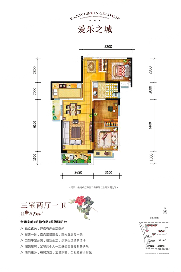 各个空间户型方正,方便室内家具布置;全明户型,各部分空间均有窗,可保证整体空间采光和通风,居住舒适度好;整体空间布局合理,能够保证动静分离和居室通风,方便使用;卧室厨卫等各个功能区的面积大小都比较合理,居住体验便利,整体舒适度高;公摊高于15%且低于25%,符合住宅公摊正常范围。