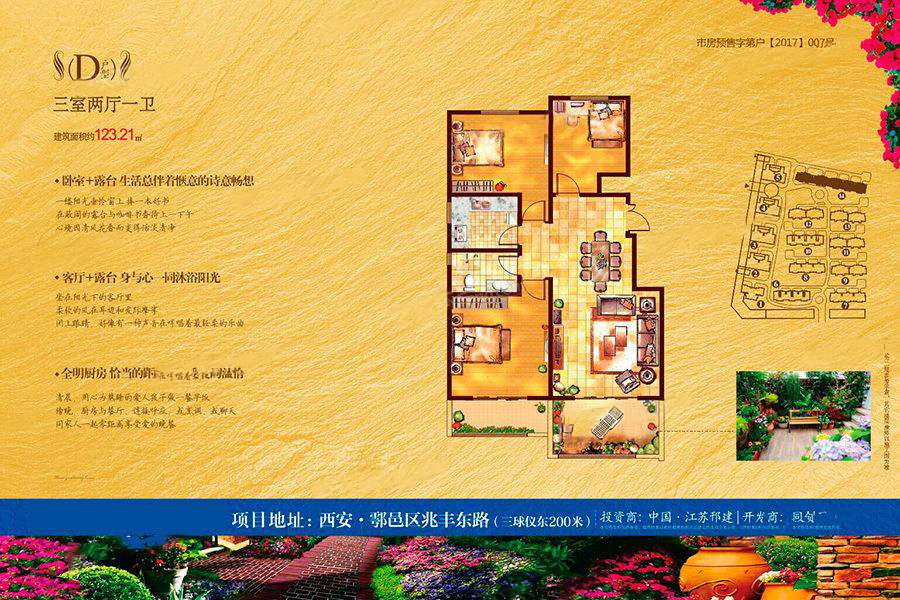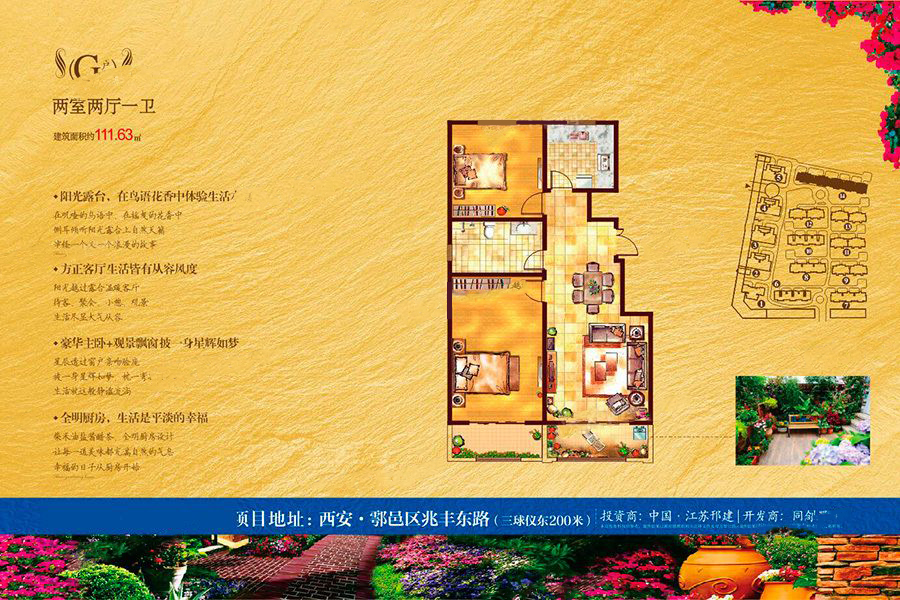 金色家园占地80亩,总建面13万余平米,由5栋27层高层,8栋电梯花园洋房组成。 金色家园秉承“以人为本”、“尊重自然”、“可持续发展”原则,以“组团化”精心雕琢打造户县英伦风情园林景观,三重风景系列升华“一步一景,移步异景”的享受,追求的正是一种至高无上的理想佳境,盛载居者的荣耀与惬意。