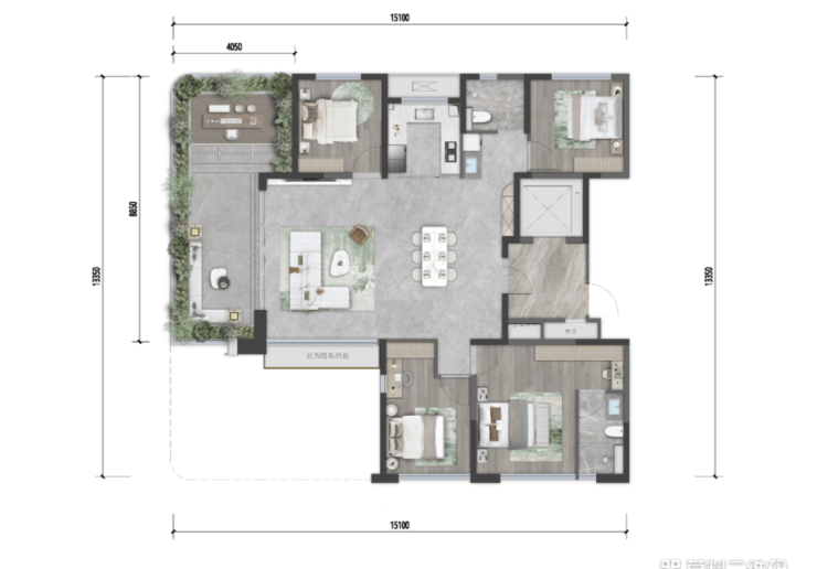 功能型四房设计,约30-32㎡观景露台,约5㎡私享入户前厅,约23㎡酒店式套房主卧,约126%实享空间,尽揽蔚然风景