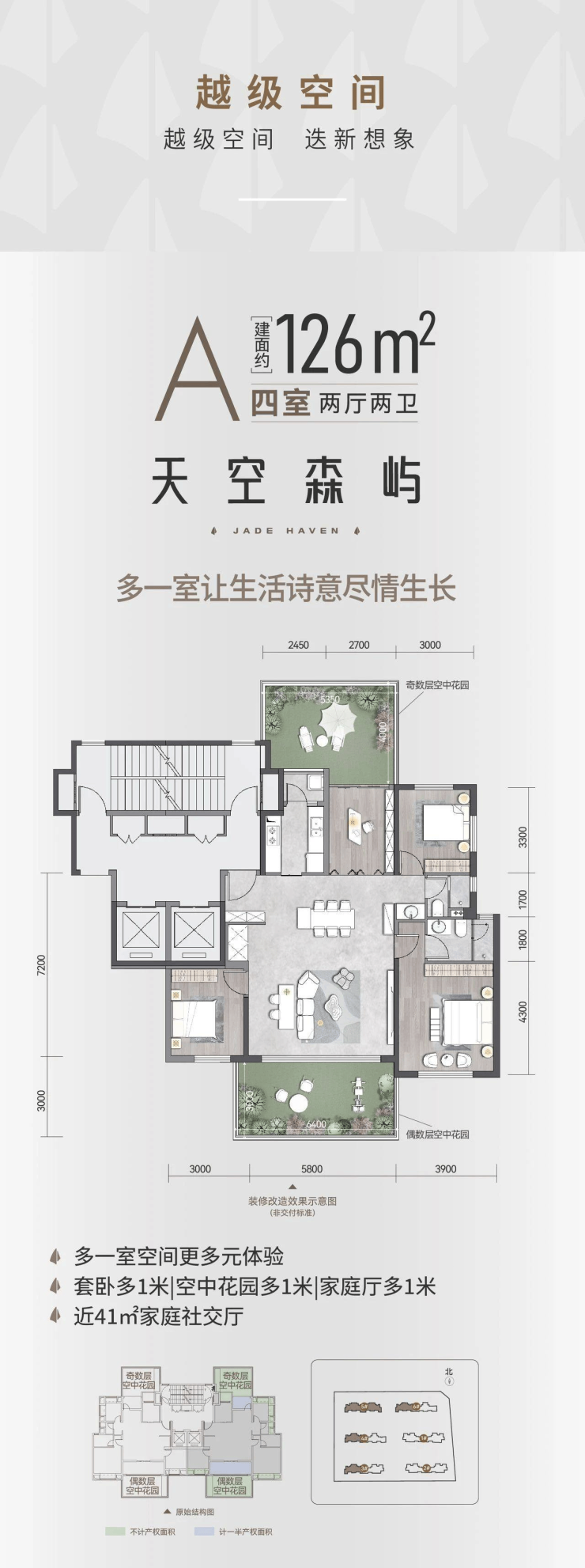 项目打造低密洋房住区,突破四代宅常规业态设计,呈现空中浮岛式花园洋房,革新区域人居。以约2.5低容积率,保持洋房的亲地性,尽享生活尺度。