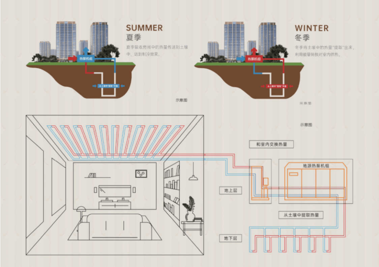 地源热泵系统冬暖夏凉:夏天将热量排入土壤,冬天从土壤中吸取热量。[低碳排放]:只有能量交换,而无介质交换。[更加节能]:此系统使用电能及地温资源,比传统空调更节能。