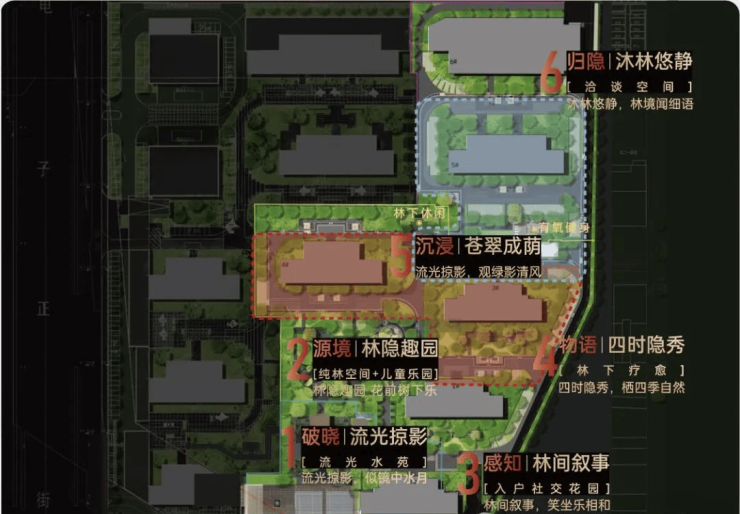 六景:林下阅读区、全龄活动区、户外学习区、林下休闲区、青年健身区、户外洽谈区
