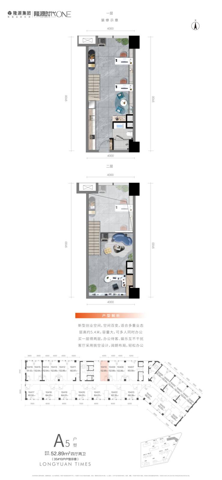 建筑面积约50-85㎡精奢著作,荣耀面世。层高约5.4米,打造双层生活,三室两厅两卫格局,满足一家人的阔朗生活,双气入户、动静分区合理,工作、生活、会客……多种生活形态融为一体,充分满足你所需要的style。