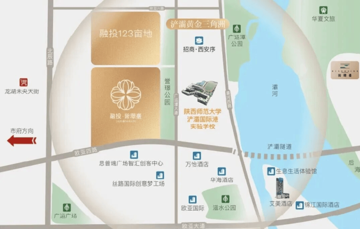 【项目地址】中国·西安·浐灞黄金三角洲,陕师大浐灞国际港实验学校西侧