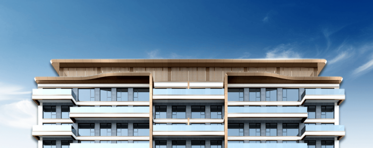 外立面采用低彩度的银灰色元素,规律阵列的露台,整体再搭配香槟色曲线造型、打造科技感的时尚公建化立面