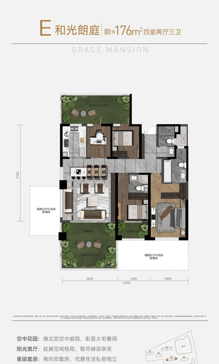 实力巨著建筑面积约115-176㎡奢适空中庭院。