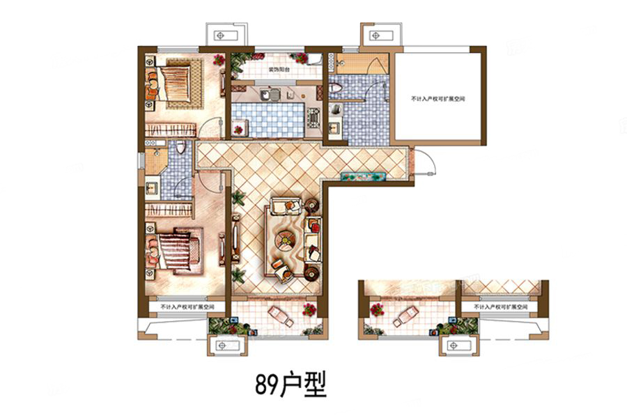 各个空间户型方正,方便室内家具布置;全明户型,各部分空间均有窗,可保证整体空间采光和通风,居住舒适度好;入户门进厨房需要穿过客厅;卧室进卫生间需要穿过餐厅或客厅;厨房门对着客厅,室内通风好,则无需顾虑油烟的困扰;客厅、卧室、卫生间和厨房等主要功能间的尺寸以及比例适中,有利于采光和通风,居住起来舒适、